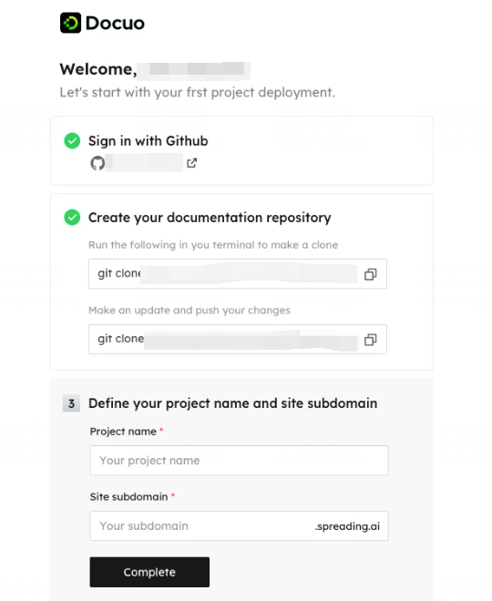 The last step is to define your project name and site subdomain. We will help you apply for your docs website domain. Type in your project name, and the subdomain will be automatically filled in. You can re-enter the subdomain you like. Then hit "Complete" to finish set up process.